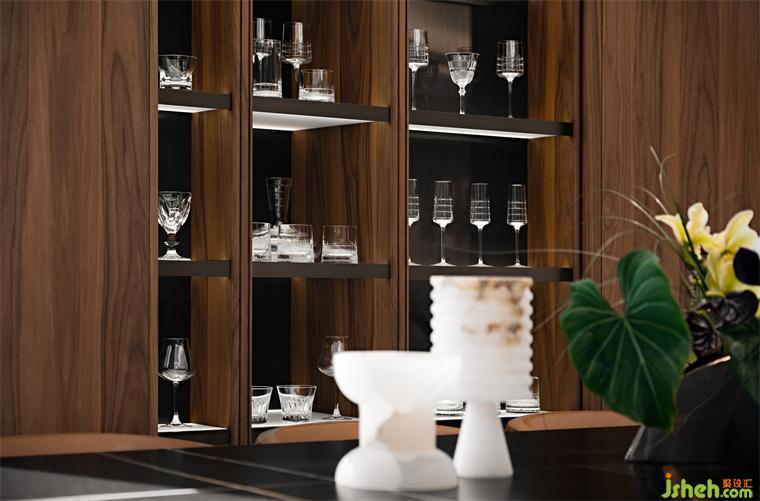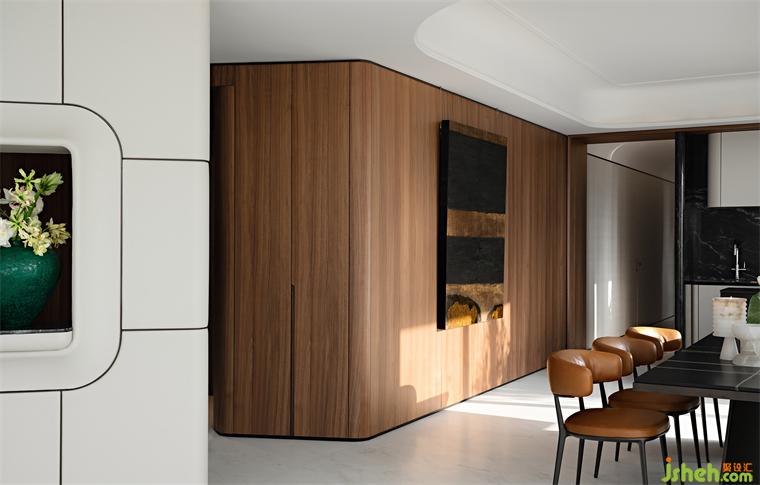 所謂“人養(yǎng)晶、晶養(yǎng)人”,業(yè)主對水晶有著天然的好感與偏愛,擁有數(shù)不清的巴卡拉。大平層設計餐廳的曲面墻因勢化身水晶的展示舞臺,移門開合間,琳瑯滿目的水晶熠熠生輝,極具秩序美感。這些不僅是物質(zhì)性的外在流露,更是情感性的向內(nèi)延伸。
