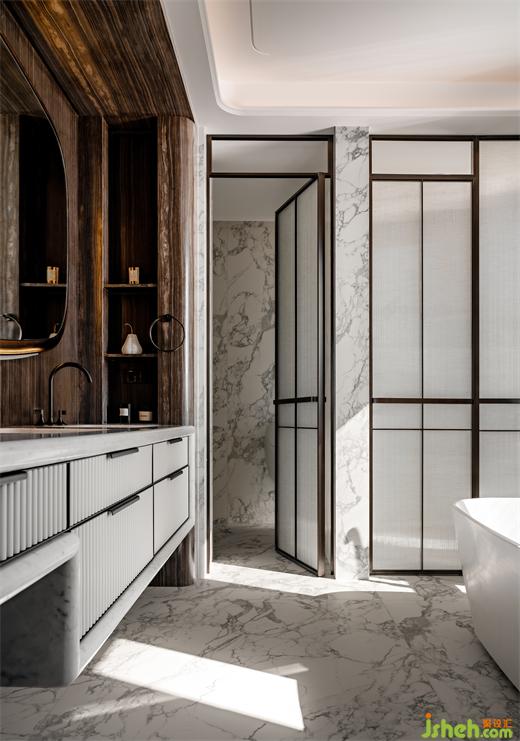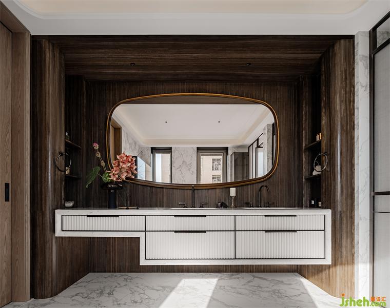 主衛(wèi)借由現(xiàn)代手法,描摹古典之韻,啞光奧巴馬木紋大理石與銅制鏡面在多材質(zhì)的組合混搭碰撞中,格調(diào)頓出。