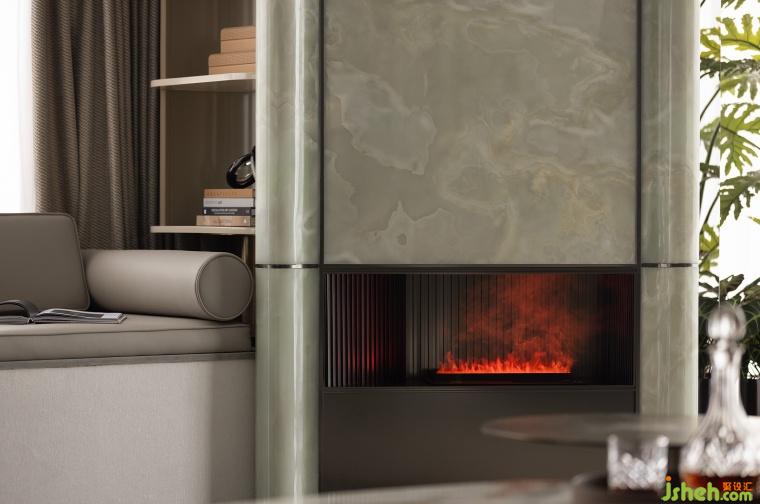 樣板房設(shè)計的細節(jié)之處不在于繁復(fù)的堆砌,而是設(shè)計師的巧思。艾未設(shè)計強調(diào)生活與藝術(shù)的融合,壁爐與客廳背景墻以青玉石鋪就,飄窗與角落書架則是輕松閱讀的有效引導(dǎo),豐盈的綠植也給室內(nèi)帶來了無限生機。