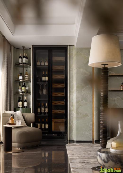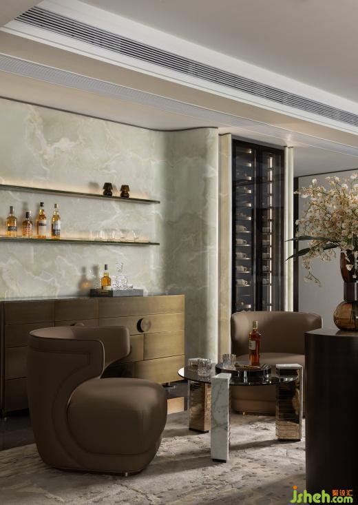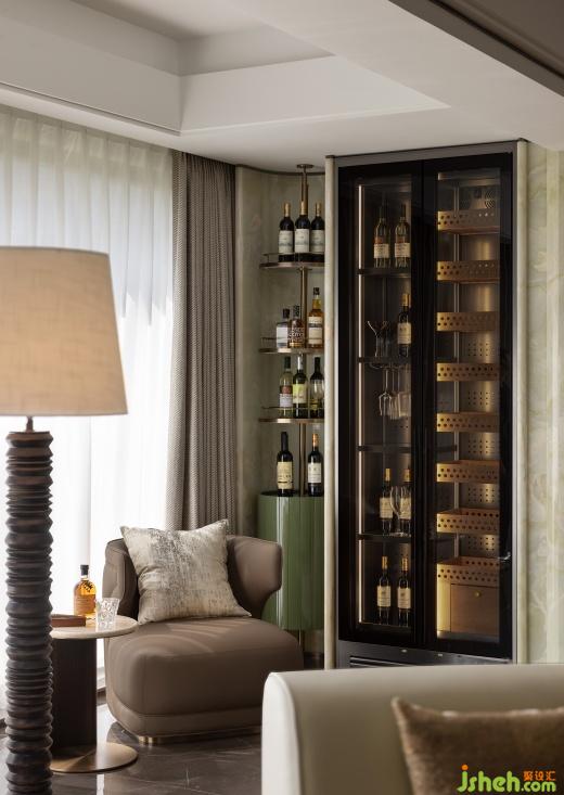 弧形沙發(fā)后的一組休閑椅,旨在實現(xiàn)生活方式及場景需求的變換組合。既是茶臺,亦可是開放的親子空間。同時有效利用墻體和飄窗,定制豐富的藏酒區(qū),以美學(xué)介入未來生活,透露居者品味之余,讓這一隅也擁有著無限延展性。