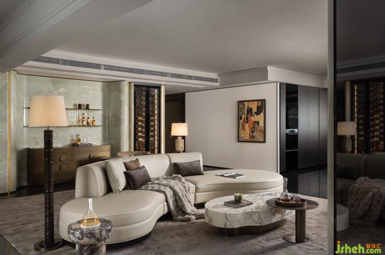 約270°的環(huán)幕視野,讓陽光肆意傾灑,觀景效果極佳。光影勾勒形體,色彩渲染風(fēng)格,以打造能量社交場。視覺的溫暖和青玉石帶來的溫潤質(zhì)地,在淡雅柔軟的飾面映襯下,散發(fā)著慵懶愜意之感。