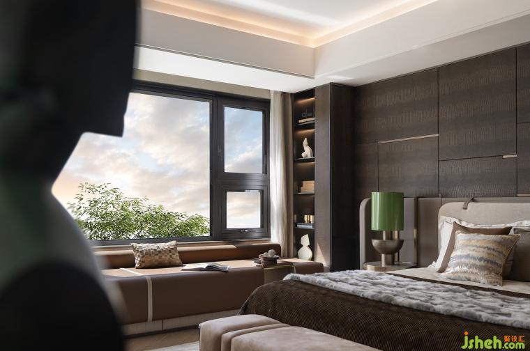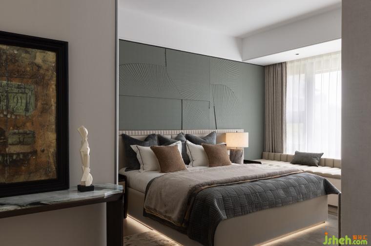 次臥延續(xù)開篇儀式感,以特殊工藝手法打造的床背極具特色,床頭柜與飄窗一體鏈接,與整體流線相結(jié)合,勾勒出豐潤舒暢的狀態(tài)。突出的材質(zhì)紋理,以涓涓細(xì)流述說著生活的詩意。