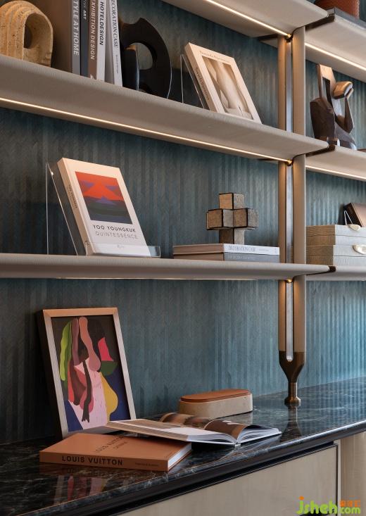 樣板房設(shè)計(jì)集收藏、私享于一體的書房區(qū),摒棄冗雜的裝飾,展示架墻面與特殊木紋墻紙拼接,勾勒出立體層次。同時(shí)利用柜體增設(shè)折疊床,以靈活實(shí)現(xiàn)展開或折疊之態(tài),打造成多功能靈動(dòng)空間。
