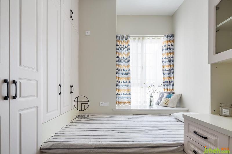 客房木作榻榻米床鋪與大面積收納柜,休閑飄窗依然打造的清新可人