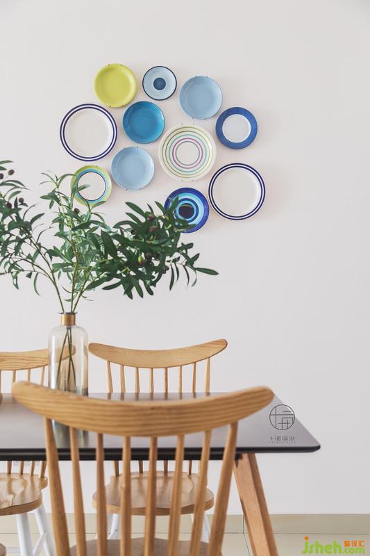室內(nèi)設(shè)計(jì)師將木質(zhì)餐椅搭配深色桌面,柔和乳膠漆墻面點(diǎn)綴彩盤墻飾,與餐桌綠植提亮空間色彩