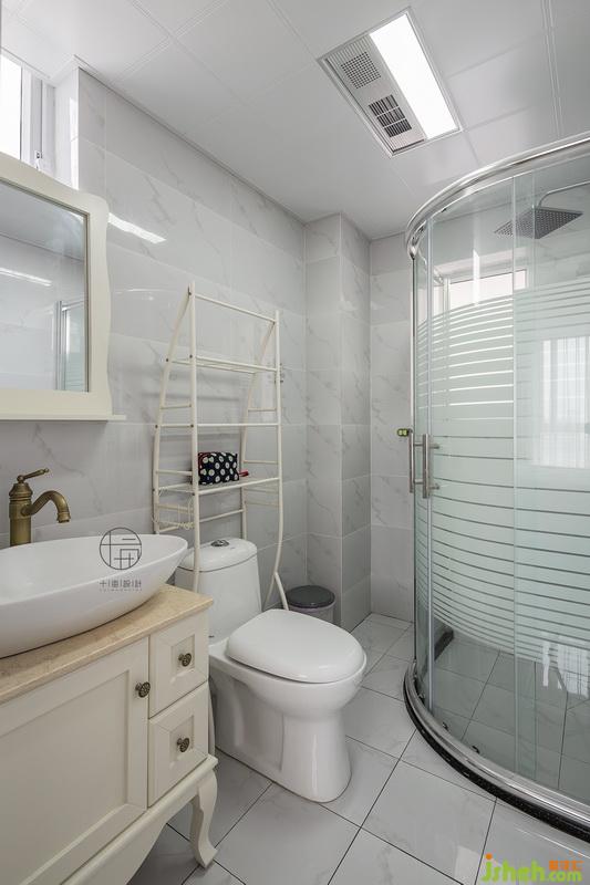 主衛(wèi)整體室內(nèi)設(shè)計(jì)師以灰色為基調(diào),成品浴室柜搭配白色衛(wèi)浴用品,簡單實(shí)用,玻璃淋浴房做到空間干濕分區(qū)