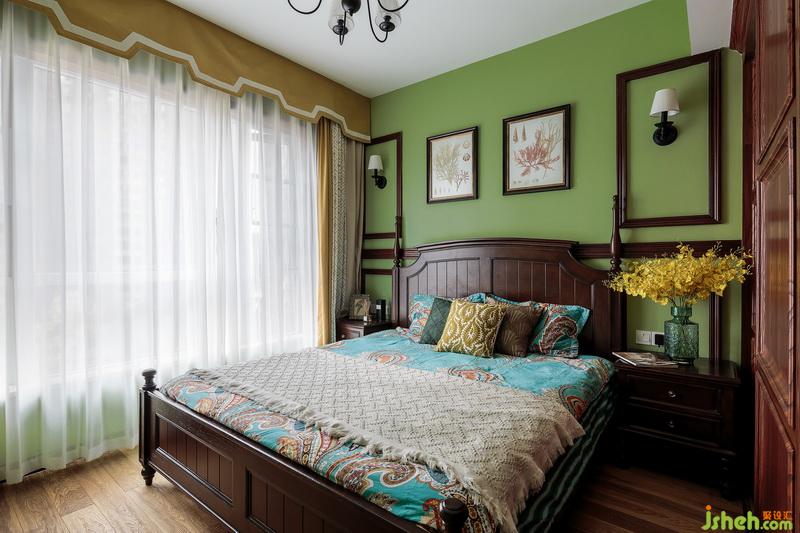 主臥室內(nèi)設計師延續(xù)森林綠的床背景,深木畫框與裝飾畫點綴造型