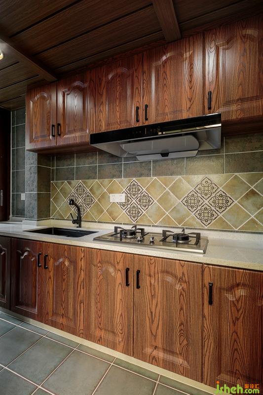 廚房復(fù)古磚配花磚點綴,配以木紋柜門,頂面室內(nèi)設(shè)計師在設(shè)計采用木色拉槽處理