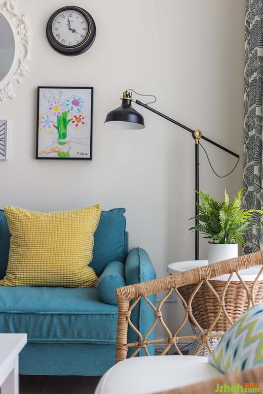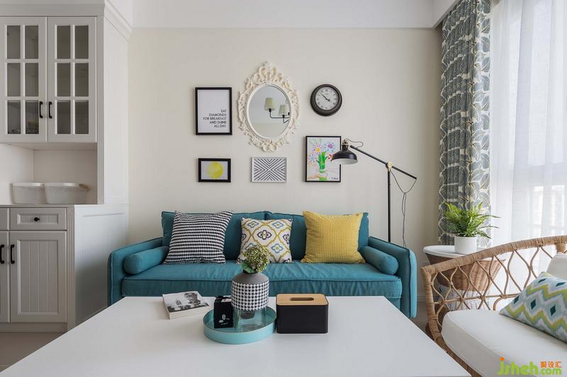 藍色主沙發(fā)點綴跳色靠枕,背景室內設計師采用不同的墻飾與簡框畫裝飾出不對稱的美