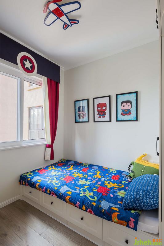 兒童房木作榻榻米連接置頂儲(chǔ)物柜,室內(nèi)設(shè)計(jì)師在書(shū)桌吊柜滿足學(xué)習(xí)休閑機(jī)能,美隊(duì)主題窗簾與機(jī)器人床品迎合男孩喜好