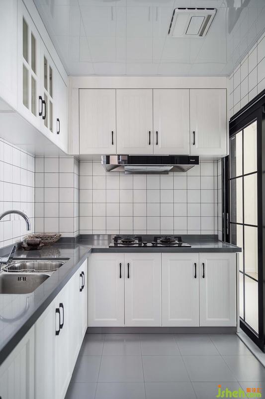 廚房,室內(nèi)設(shè)計(jì)師采用深淺灰與白色穿插,小白磚讓空間更具年輕感,打造層次視覺(jué)空間