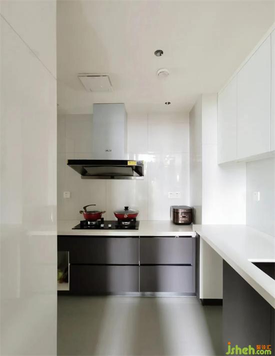 廚房色調(diào)搭配上明暗分明,黑白灰配色延續(xù)經(jīng)典。家裝設(shè)計地柜用黑色,增加厚重感與安全感。吊柜用白色,增加空間明亮度。