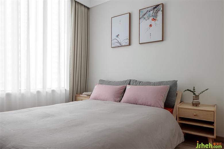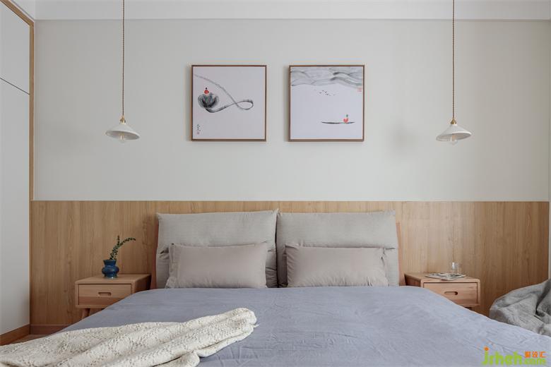 臥室色調(diào)與主色調(diào)一致,木色淺色間錯(cuò)使用。家裝設(shè)計(jì)以柜體一色的木飾面作為床頭背景墻的底色,既舒展了空間的視覺(jué)效果,又突出了臥室的功能性,顯得柔暖舒適。家裝設(shè)計(jì)