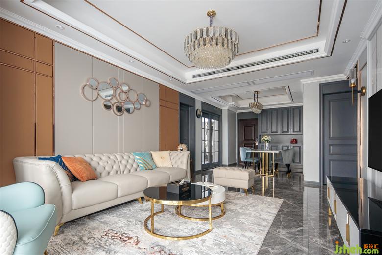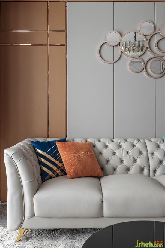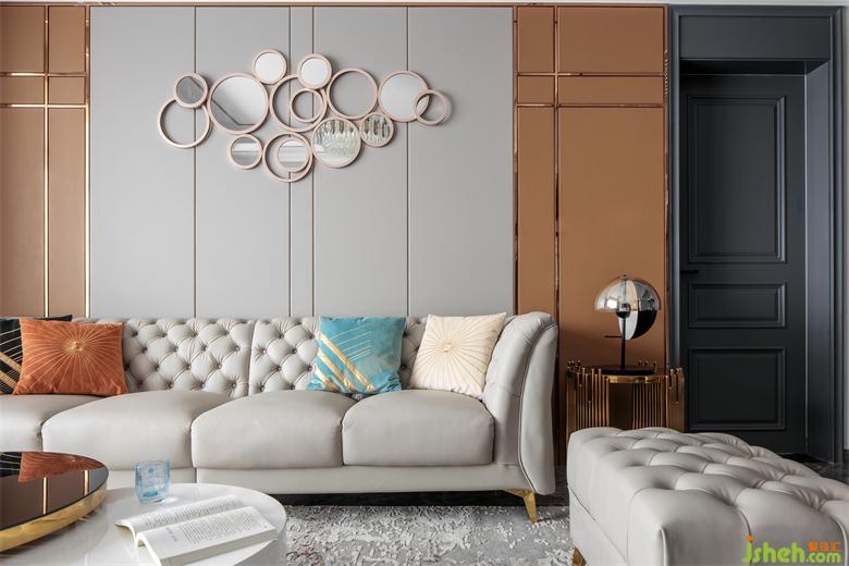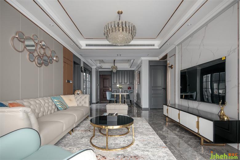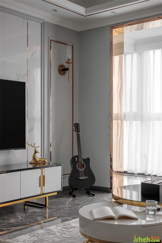 The house is square and broad. The ground and TV wall are made of bright ceramic tiles. Black and white color highlights the strong contrast between light and shade. Classic and noble coexist. The mirror is inlaid in it. It is as clear as water. The light and shadow effect is excellent, greatly improving the sense of spatial level.