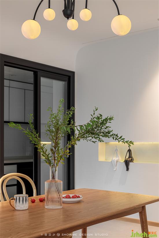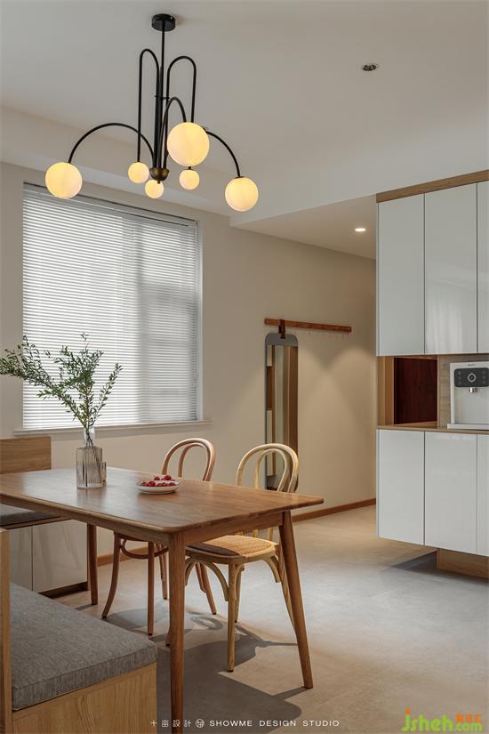 陽光透過百葉窗,均勻地灑進屋里。家裝設計清新的白色和溫暖的木色搭配在一起,所有的煩躁不安在這一刻被治愈,空氣也變得寧靜溫柔起來。