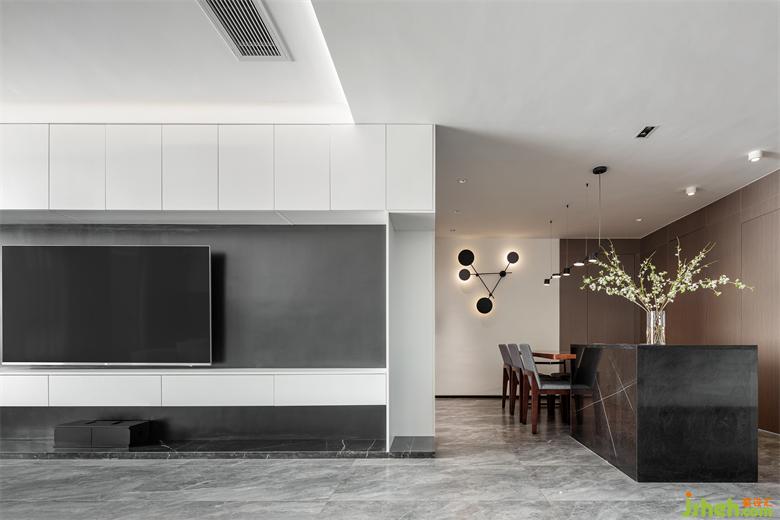 The TV wall is used as a cabinet to improve the storage. At the same time, the black-and-white gray tone is consistent, with wrong color blocks, and rich visual levels.