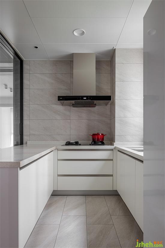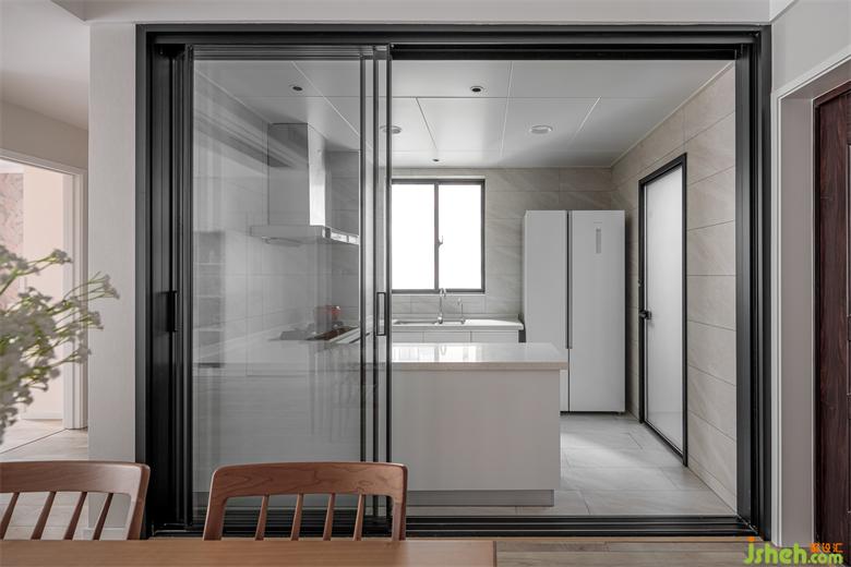 吧臺(tái)設(shè)計(jì)利用玻璃移門(mén)的開(kāi)合,起到了功能區(qū)分的作用:關(guān)門(mén)時(shí)作為廚房的操作臺(tái),開(kāi)門(mén)時(shí)作為和餐廳互動(dòng)的吧臺(tái),可休閑,可傳菜。