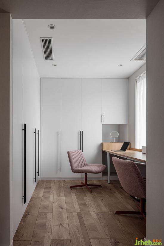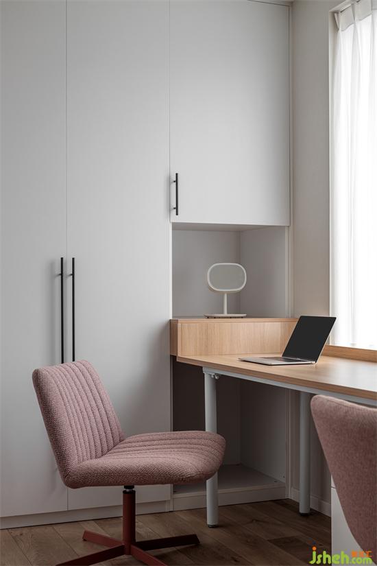 在主臥衣帽間的一角,設(shè)計了一張長書桌,可滿足兩人同時使用,把每一寸空間利用到極致,家裝設(shè)計增加了區(qū)域的功能性。