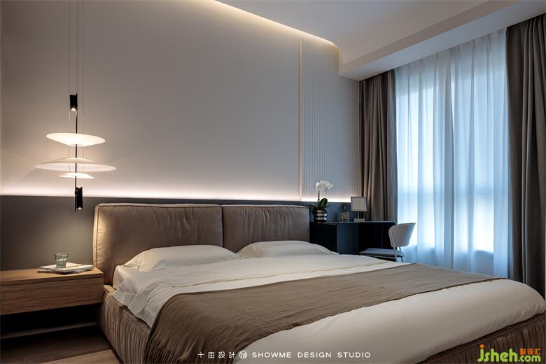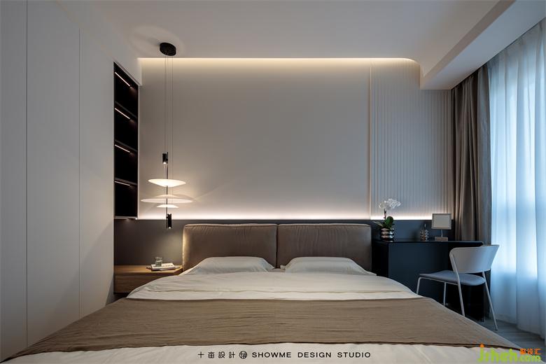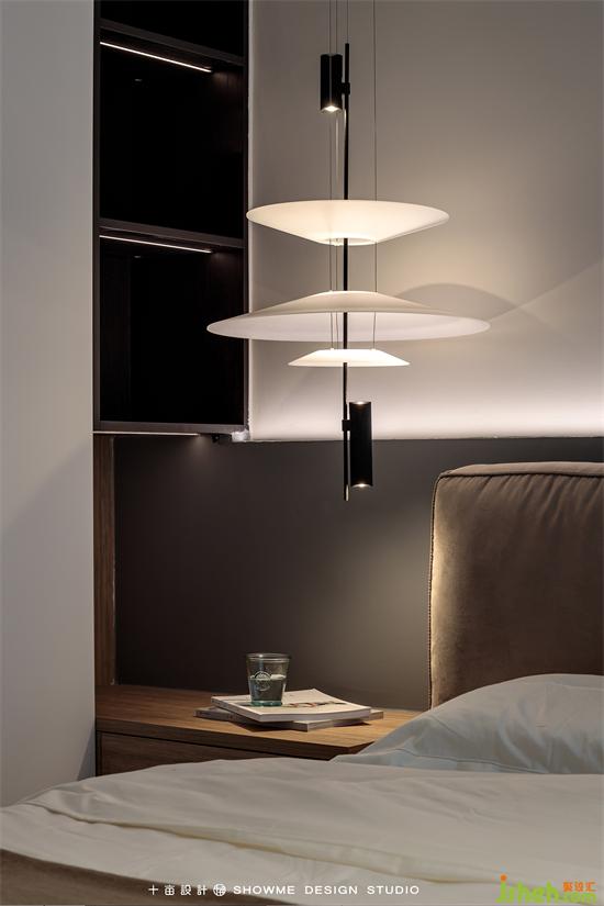 雙人床寬敞柔和,配上屋主精心挑選的床頭創(chuàng)意吊燈,家裝設(shè)計(jì)精致又充滿格調(diào)的臥室空間讓人心動(dòng)不已。