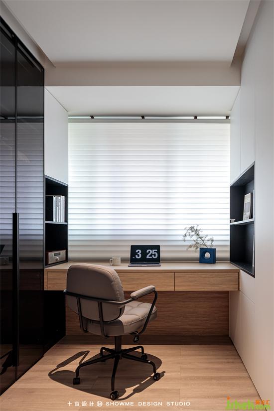 在有限的空間里,打造書桌、書柜、儲物柜一體式設(shè)計(jì),色調(diào)則采用黑色、白色與木色相間的搭配方式,家裝設(shè)計(jì)讓這里成為集收納、休閑、娛樂、辦公于一體的家居空間。
