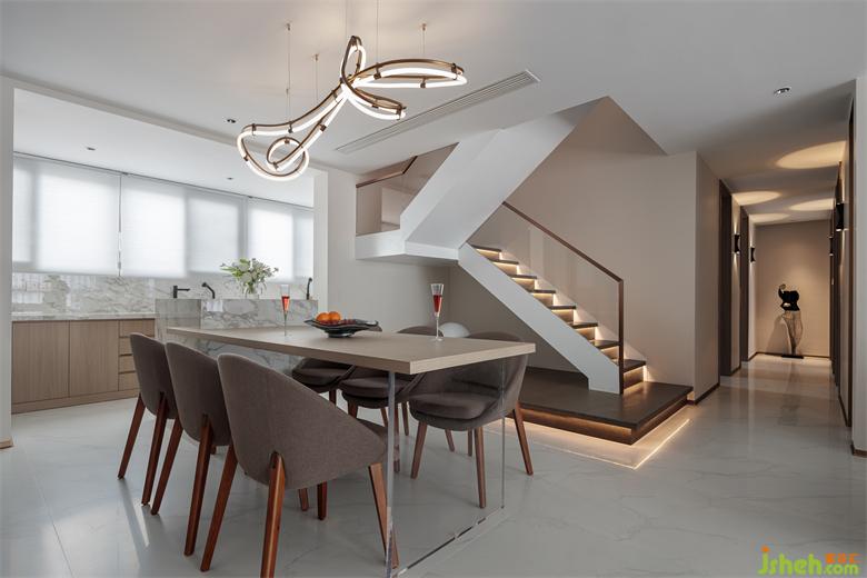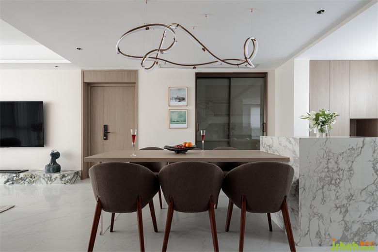 與客廳空間相互呼應(yīng),形成了良好的互動(dòng)性。而曲線彎曲造型的吊燈讓橫平豎直的空間增添了一絲妖嬈,也體現(xiàn)出不俗的審美。