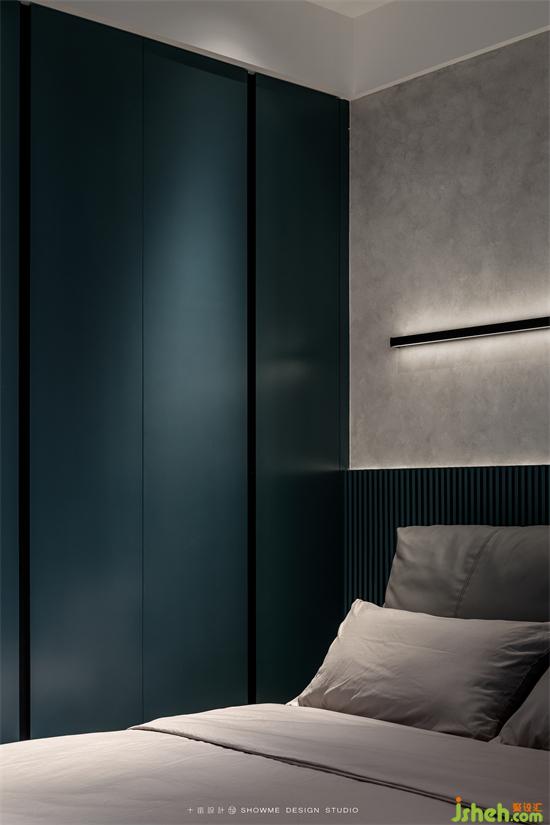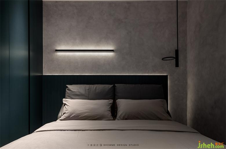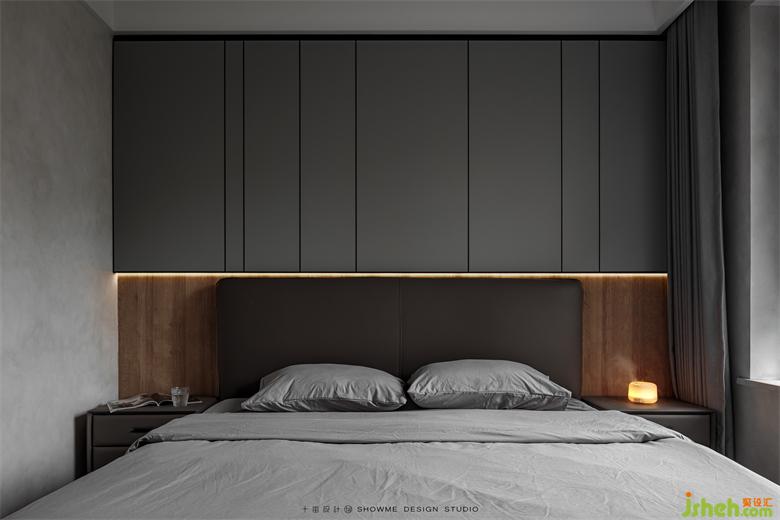 臥室也保持了一以貫之的黑白灰風(fēng)格。木色背景板和簡潔流暢的線條設(shè)計(jì)是臥室的主基調(diào),內(nèi)江邦泰天著家裝設(shè)計(jì)沒有繁復(fù)的臥室吊燈,利用充滿設(shè)計(jì)感的燈帶帶來的柔光來營造溫馨舒適的氛圍。