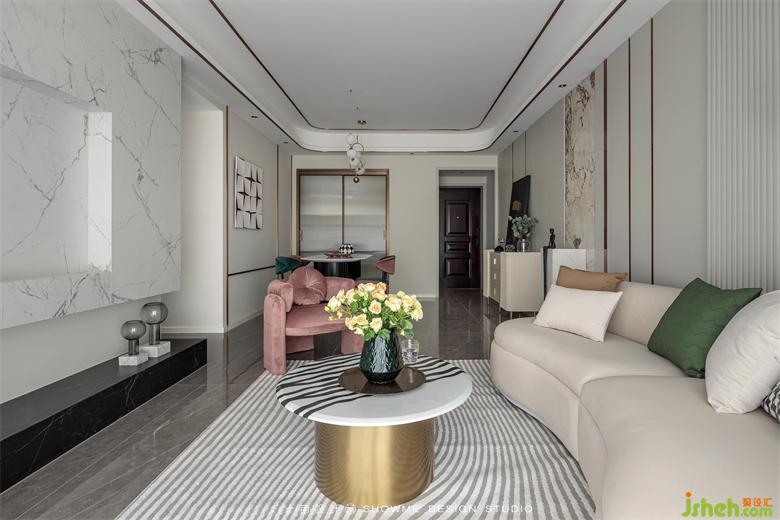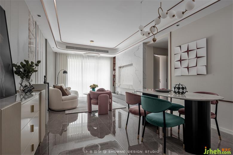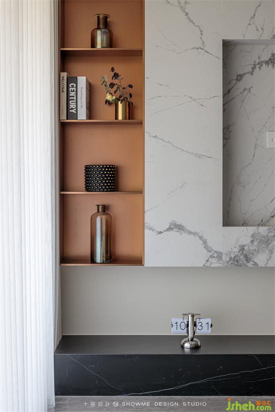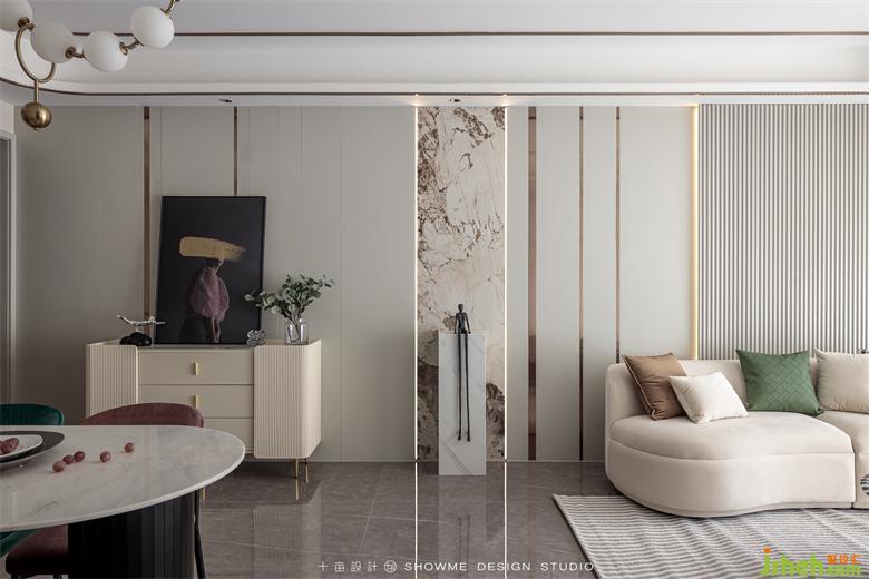 電視背景墻才用了當(dāng)下最流行的白色巖板材質(zhì),與黑色的地臺(tái)形成色彩上的鮮明反差。
