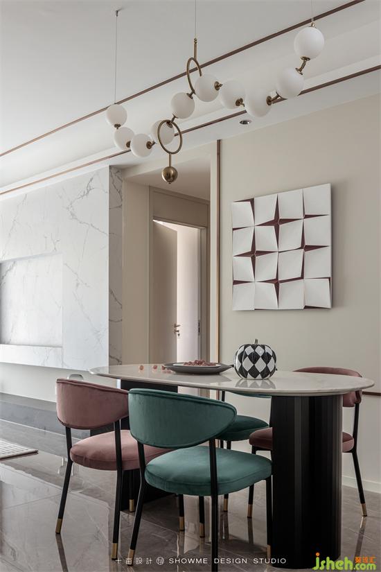 餐廳以簡(jiǎn)約實(shí)用為主,摒棄過(guò)度的裝飾,在餐桌墻上只需一副凹凸有致的掛畫(huà),頤和上院家裝設(shè)計(jì)空間效果立馬提升起來(lái)。