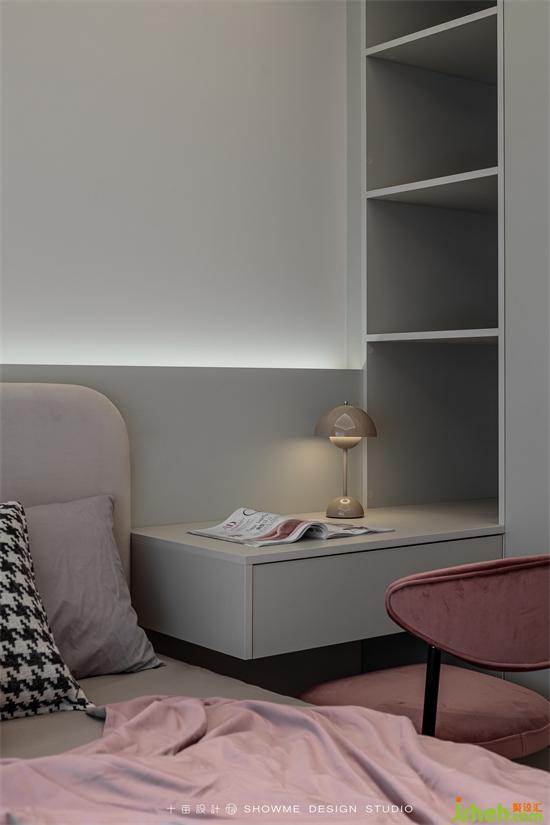 區(qū)別于主臥的整體墻面軟包,次臥選擇半墻軟包以達到視覺分層的效果。定制柜上墻的優(yōu)點明顯,既節(jié)省了空間,又可以做到一柜多用。