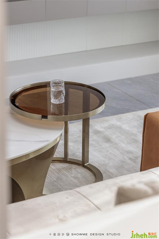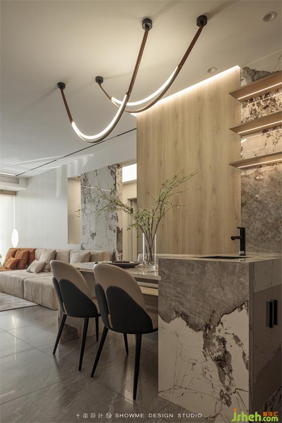 木色與花色巖板交替搭配,錯落有致,曲線造型的吊燈與巖板的硬朗形成剛?cè)釋Ρ?,視覺效果非常贊。