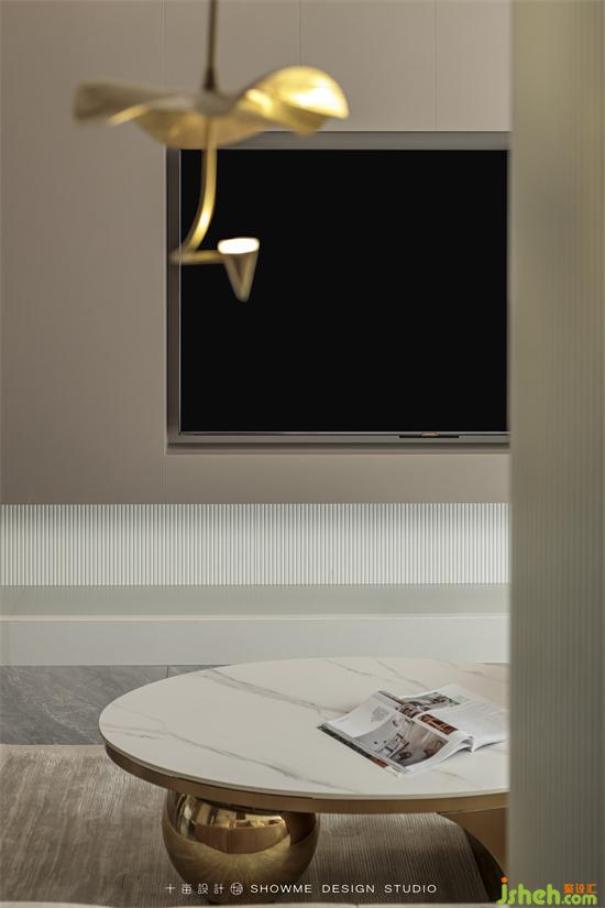 嵌入式電視墻保持了空間的整體性,跳躍的爐火為一字型地臺增添一抹亮色,豐富了整個空間層次。