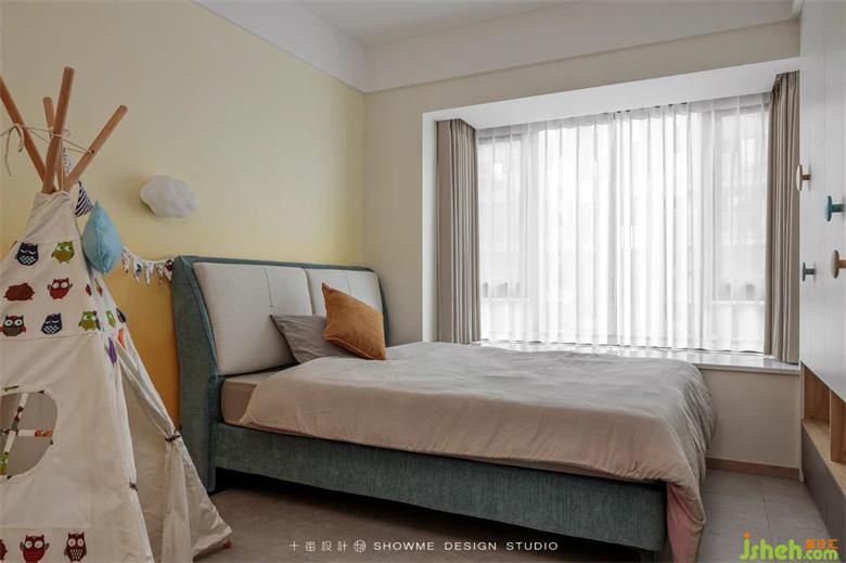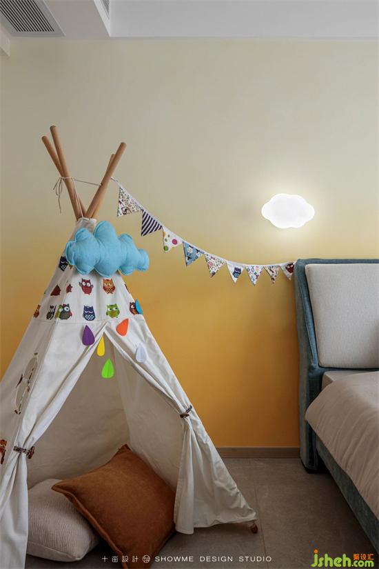 兒童房的風(fēng)格充滿了童趣,云朵形狀的壁燈像極了小朋友奇幻的夢想,印第安小帳篷是小朋友最愛的游戲空間,國賓上院家裝設(shè)計彩色衣柜扣點(diǎn)綴出五顏六色的童話故事,而一切的一切,都源于爸爸媽媽滿滿的愛。