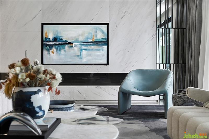 一層客廳的空間設(shè)計中強化了挺直的線條感,散發(fā)出嚴謹與端莊,墻面的大理石紋烘托低調(diào)奢華的品質(zhì)。在陳設(shè)設(shè)計上,通過挺闊的輪廓線條和大氣的造型呼應(yīng)并加強了感性的審美。