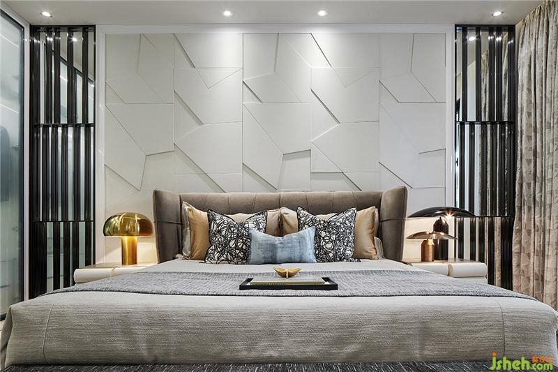 移步主臥,設(shè)計師回應(yīng)了對經(jīng)典時代的懷念,并進行當代再造,主臥色調(diào)溫馨柔和,家具輪廓瑰麗華美,奢華大氣,無一不流露著那份高貴典雅,營造溫馨華貴的海派氣氛,落地燈與小邊幾的金屬質(zhì)感,在令人回望老上海的摩登與高貴時,亦更沉醉于現(xiàn)代生活的精致。