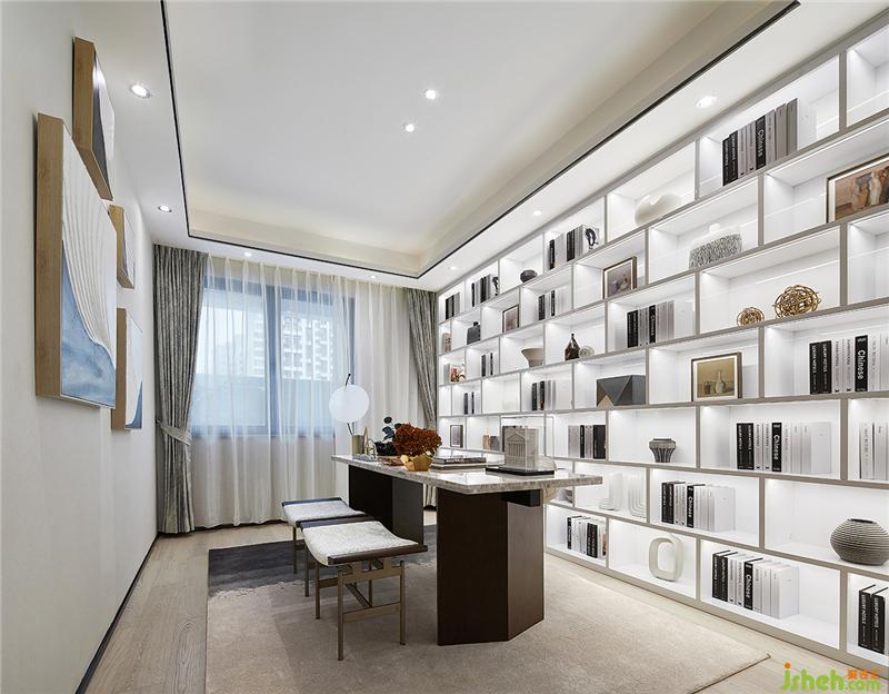 儒雅書卷氣,一身翰墨香。書房是一個家的文化載體。書房以質(zhì)感、沉穩(wěn)的新海派風格家具,在整體色彩上以白色調(diào)為主,加一些小面積的金屬與藍色點綴,打造低調(diào)輕奢氛圍