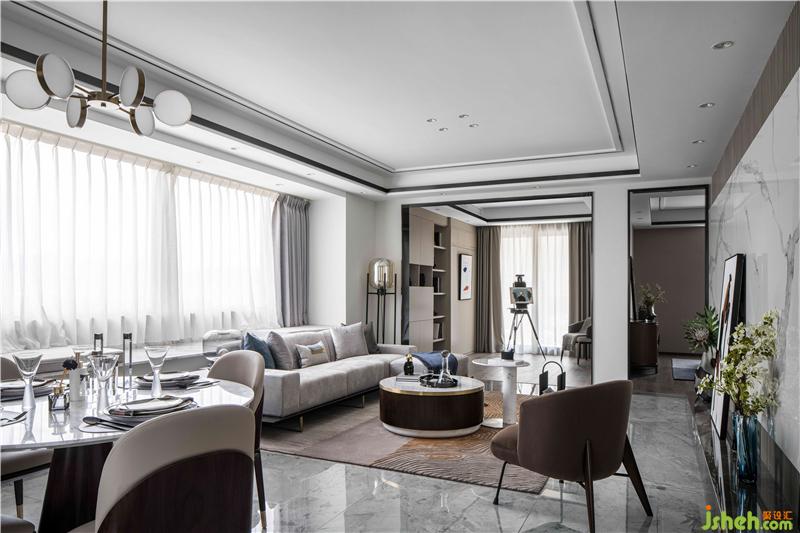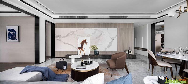 客廳大理石背景墻的天然肌理與淡雅溫和的木飾面相結(jié)合,二者質(zhì)感對(duì)立卻相互融合,營(yíng)造出空間的默契感。樣板房設(shè)計(jì)