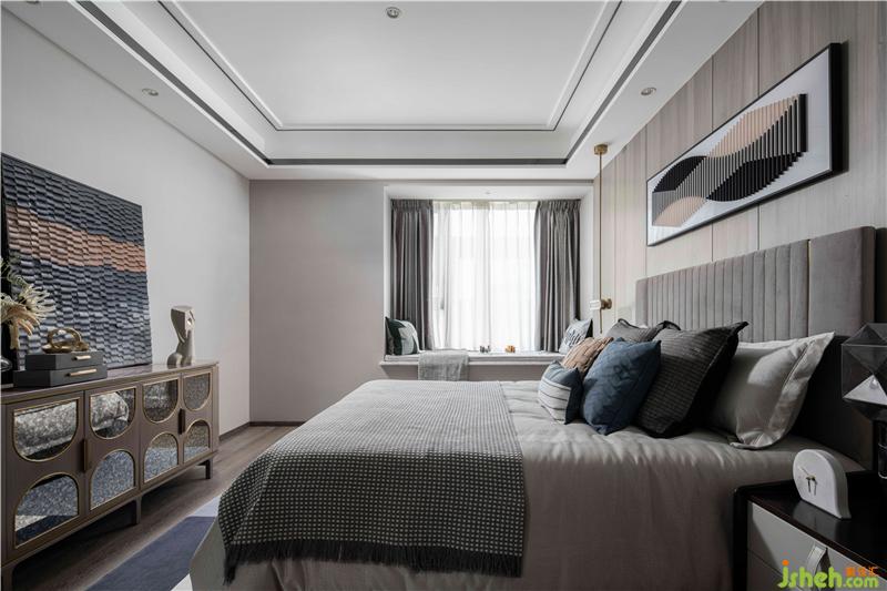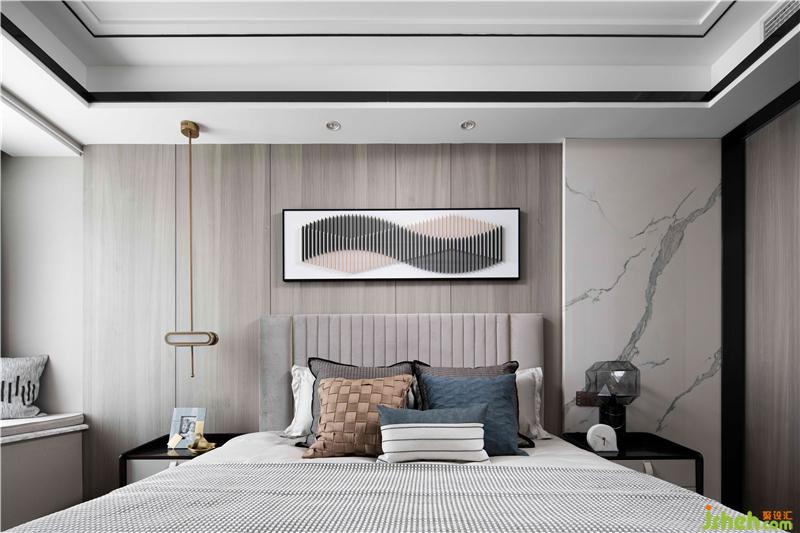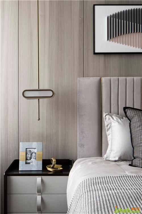 主臥的設(shè)計(jì)大氣利落,大面積的木飾面搭配局部大理石的點(diǎn)綴,優(yōu)雅堅(jiān)韌的特質(zhì)被抽象地轉(zhuǎn)化為幾何線條,柔軟細(xì)膩的灰調(diào)搭配令人身心放松,空間沉靜而美好。滲透于細(xì)節(jié)之中的品質(zhì),交融出經(jīng)典與現(xiàn)代的重構(gòu)之美。樣板房設(shè)計(jì)