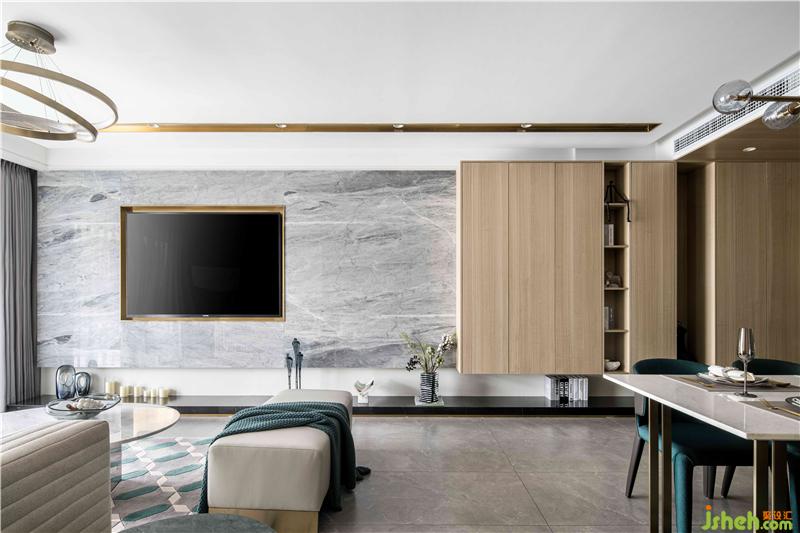 客餐廳主要以原木色為基調(diào),寶石綠點(diǎn)綴空間,呈現(xiàn)出自然舒適的生活感??筒蛷d與廚房為開放空間,賦予空間藝術(shù)、雅致而自由的生活氛圍。入戶設(shè)置鞋柜,沿著動(dòng)線延伸引出電視背景墻。大理石、金屬和木飾面的交錯(cuò)組合,豐富客廳的層次感。從入口到共享空間,有節(jié)奏的呈現(xiàn)了簡單明快、合理的結(jié)構(gòu)。樣板房設(shè)計(jì)