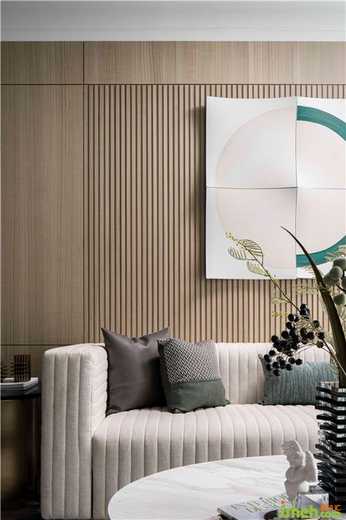 沙發(fā)區(qū)以溫柔的木色、米灰色作為主色,搭配跳躍的綠色,藉由造型和色彩的純粹性,與線條分明的硬裝相契合,線面組合達(dá)成了一種時(shí)尚與溫馨的平衡。