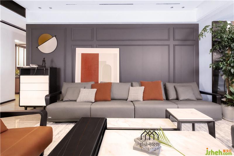 深灰色的石膏線框背景搭配現(xiàn)代簡約的落地裝飾畫,深色的空間中加入白色塊的軟裝,柳州家居裝修將空間中的深沉提亮,制造簡約清新的家。