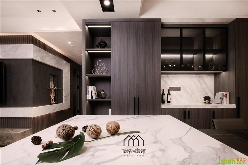 廚房區(qū)域以深木色為主,餐桌結(jié)合島臺的形式,酒柜增加水吧臺。這樣布局能保證足夠的活動空間,柳州家居裝修有效的利用了每一寸空間。可容納4人的餐桌,曲線狀的吊燈懸掛在上方,散發(fā)出暖黃色的燈光,分外和諧。