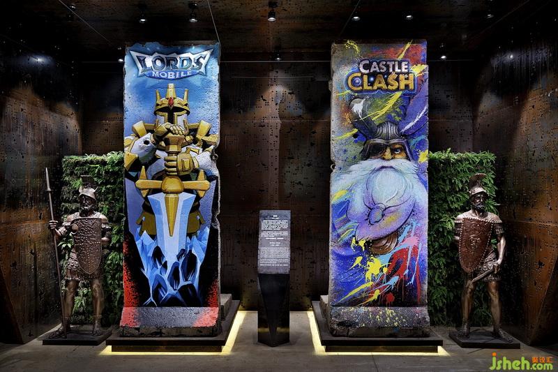 在設(shè)計(jì)初期,我們設(shè)計(jì)公司還和IGG就談到了一個共同的概念,那就是柏林墻。柏林墻作為自由的象征,是人類一直以來的追求,時(shí)刻提醒IGG不要忘記自己的追求,也就是不忘初心制造快樂娛樂玩家的企業(yè)精神。為此業(yè)主在外國訂購了兩座拆除的柏林墻,我們設(shè)計(jì)公司了解其深意后,決定把它們豎立在辦公樓的入口正前方,并且請畫師在柏林墻上繪制了目前IGG最熱門的兩款游戲《城堡爭霸》、《王國紀(jì)元》。
