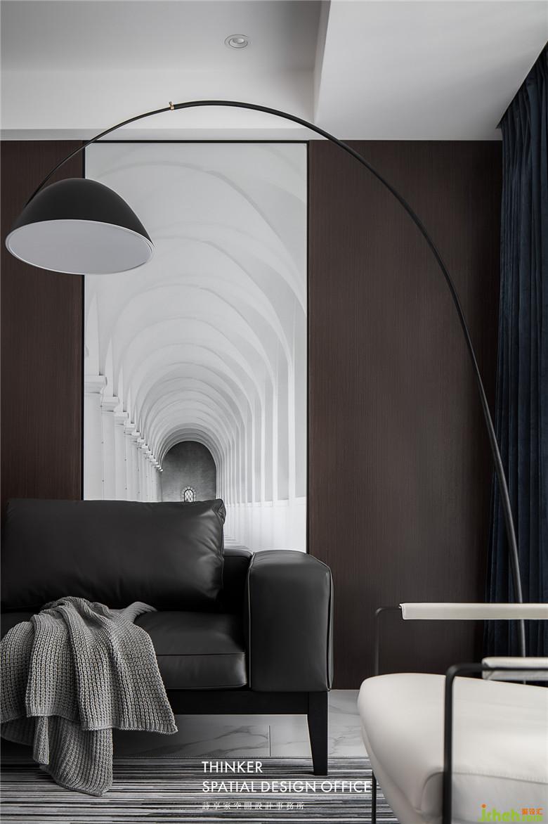 家具款式簡約明了,沙發(fā)皮革的質(zhì)感與墻面黑胡桃木紋碰撞,帶來硬朗卻又溫潤的時尚感;定制的建筑透視畫,產(chǎn)生虛實結合的視覺體驗,同時提亮了客廳的整體色調(diào)。