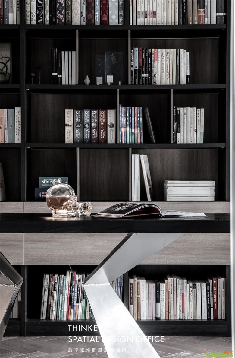 一整面墻的定制書柜是男女主人共同的心頭好,即便如此,書柜也只擺放了他們藏書的一小部分。
