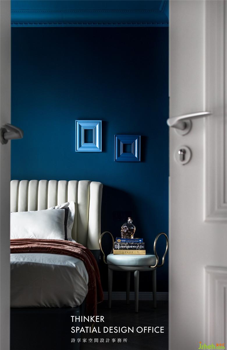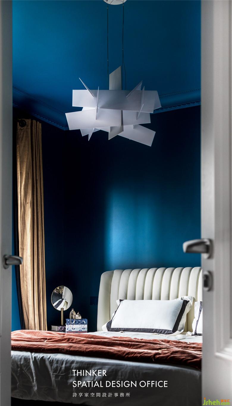 不同于公共空間的文藝氣質(zhì),臥室室內(nèi)設(shè)計師大膽地選擇了深藍色壁布,搭配金色窗簾,這種糅合了復(fù)古腔調(diào)的色彩搭配尤其迷人,展露著別樣風(fēng)情。