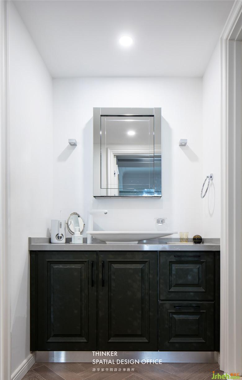 客衛(wèi)選擇了別致的鏡柜,優(yōu)美曲線的臺(tái)上盆,依然延續(xù)整體的黑白配色,純凈輕盈。