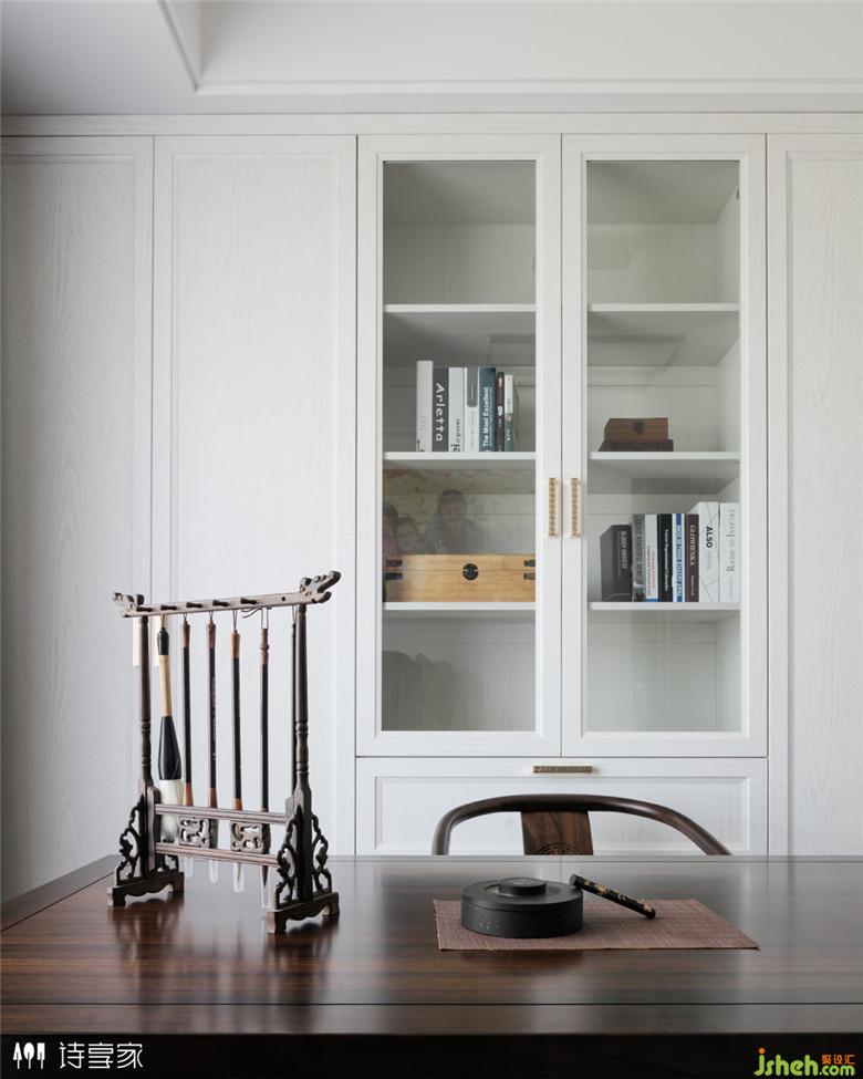 整個設計以白色和深胡桃色為主,搭配了白色的石材,讓整個空間更加豐富和層次感。地面采用水泥色的地磚,與深胡桃墻面的結合有一種古色古香的韻味。用現(xiàn)代感的金屬線條與質(zhì)樸的中式相碰撞,擦出不一樣的火花。