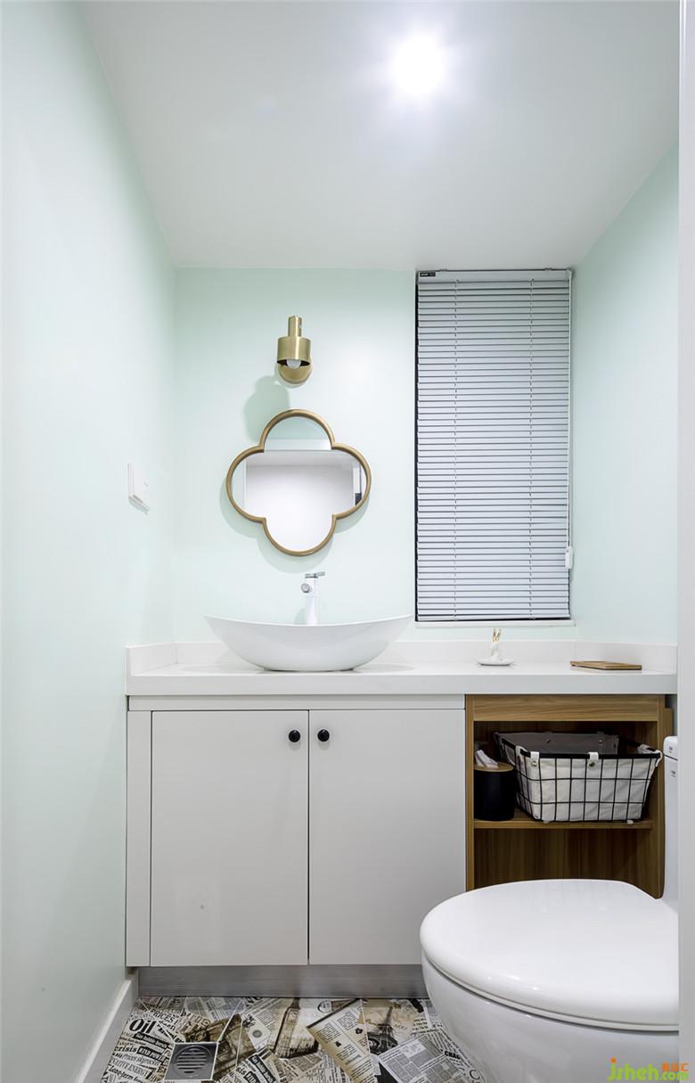 主衛(wèi)沒(méi)有設(shè)計(jì)淋浴,墻面做的防水乳膠漆,并選擇了安靜清爽的綠色,使整個(gè)空間看上去非常舒適。巧妙的儲(chǔ)物柜也解決了大部分的收納問(wèn)題。