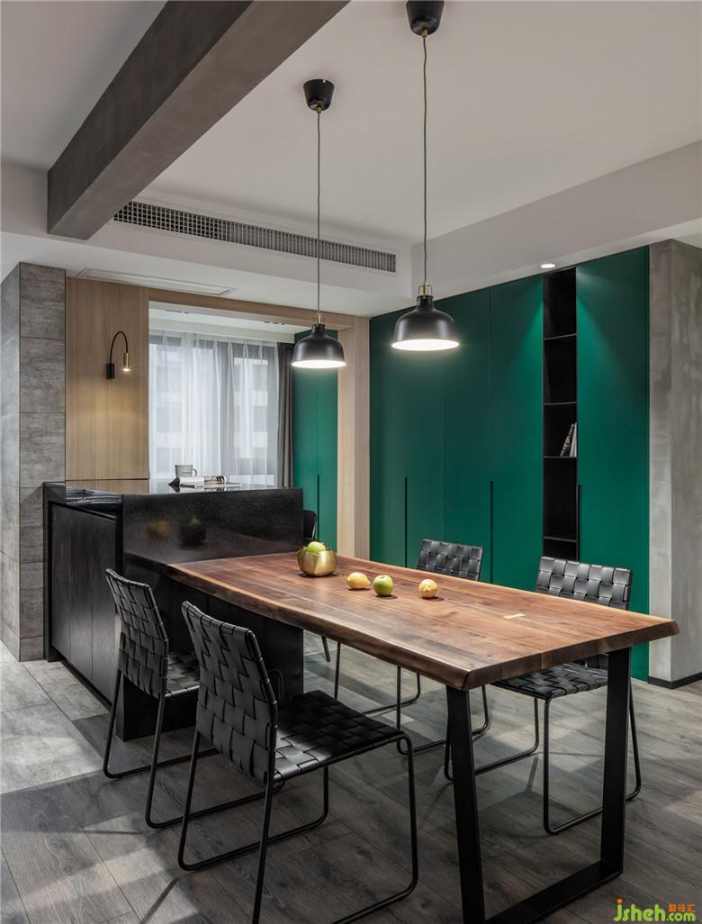 孔雀綠的柜體大大增加了收納空間,也為黑白灰基調(diào)的空間增添了勃勃生氣。