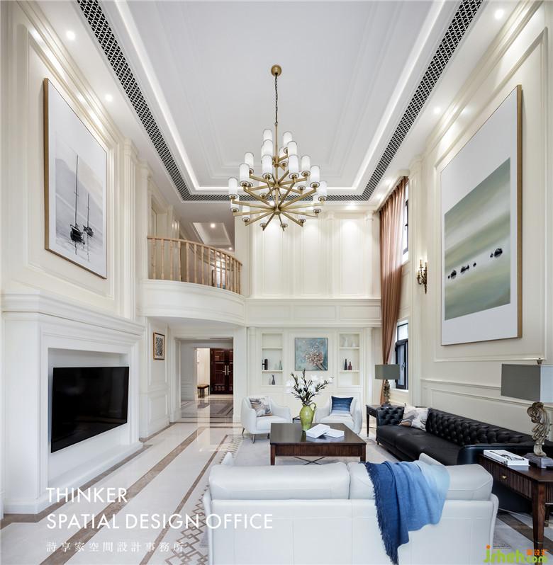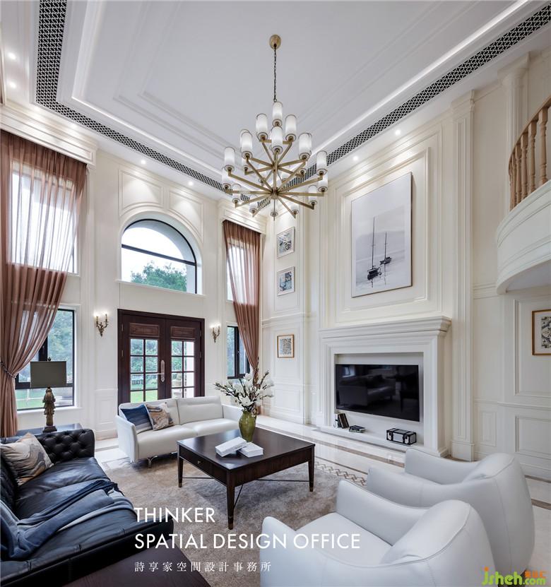 純凈的奶白色墻面,細(xì)致的線條變化帶來豐富的層次感,木質(zhì)護(hù)墻板不僅豐富了墻面造型,它溫潤的質(zhì)感也提升了空間氣質(zhì)。經(jīng)典的羅馬柱、壁爐的元素,讓挑空的客廳顯得美式風(fēng)味十足。